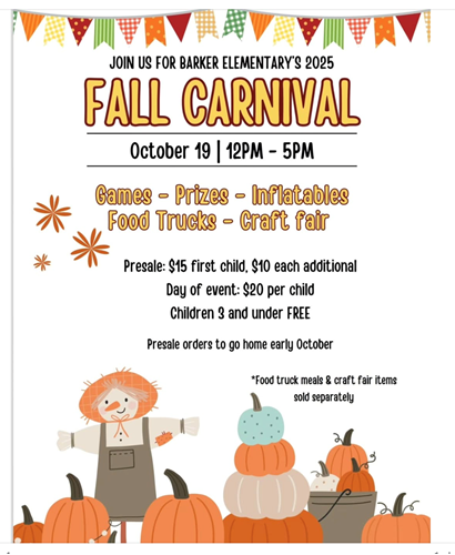Please join us on Saturday, October 19th, for Barker's Fall Carnival! The event will be held at Barker from 12:00 - 5:00. Ticket Pre sale $15 for first child and $10 each additional child. On the day of the event tickets are $20 per child. Children under 3 are free, Children must be accompanied by an adult. Games, Prizes, inflatables, and a craft Fair. Food Trucks will be available on site. Don't miss this exciting event!