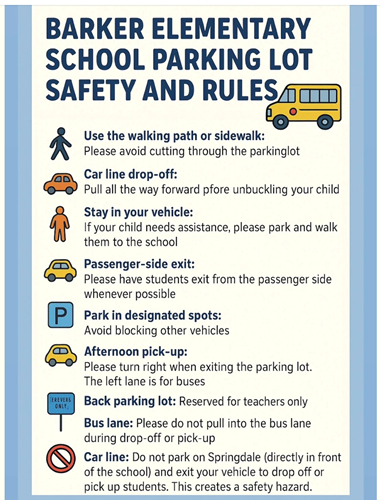 We want you to be aware that the Barker parking lot received some updates over the summer. The changes were done to eliminate blind spots that existed near the student entrance/exit gate and for better field of vision for students entering and exiting school. This was all planned with student safety in mind, which is a top priority for Barker. please note the two main changes: